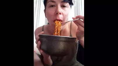 Je mange des nouilles Piquantes et je te montre mes seins